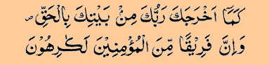 As your Lord caused you (O Muhammad ) to go out from your home(Madinah) with the truth, and verily, a party among the believers disliked it; (Al-Anfal (surah 8), verse 5)